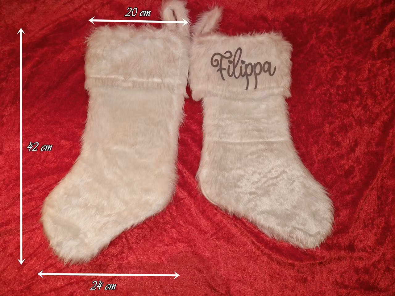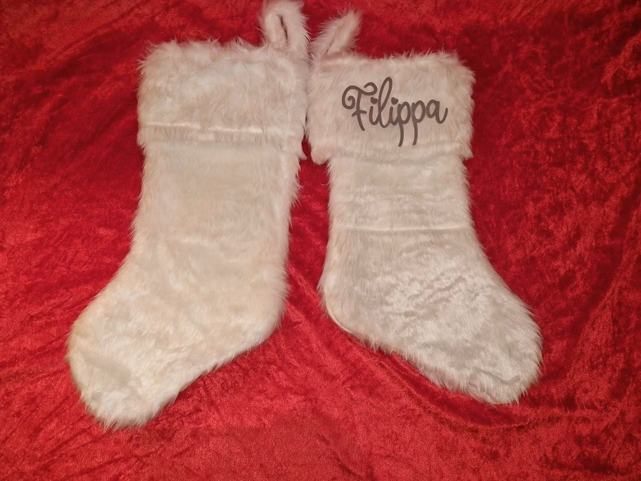 Hvite, myke strømper med personlig trykk. Strømpene på bildet har trykk i flock vinyl som gir en pusete overflate på navnet.