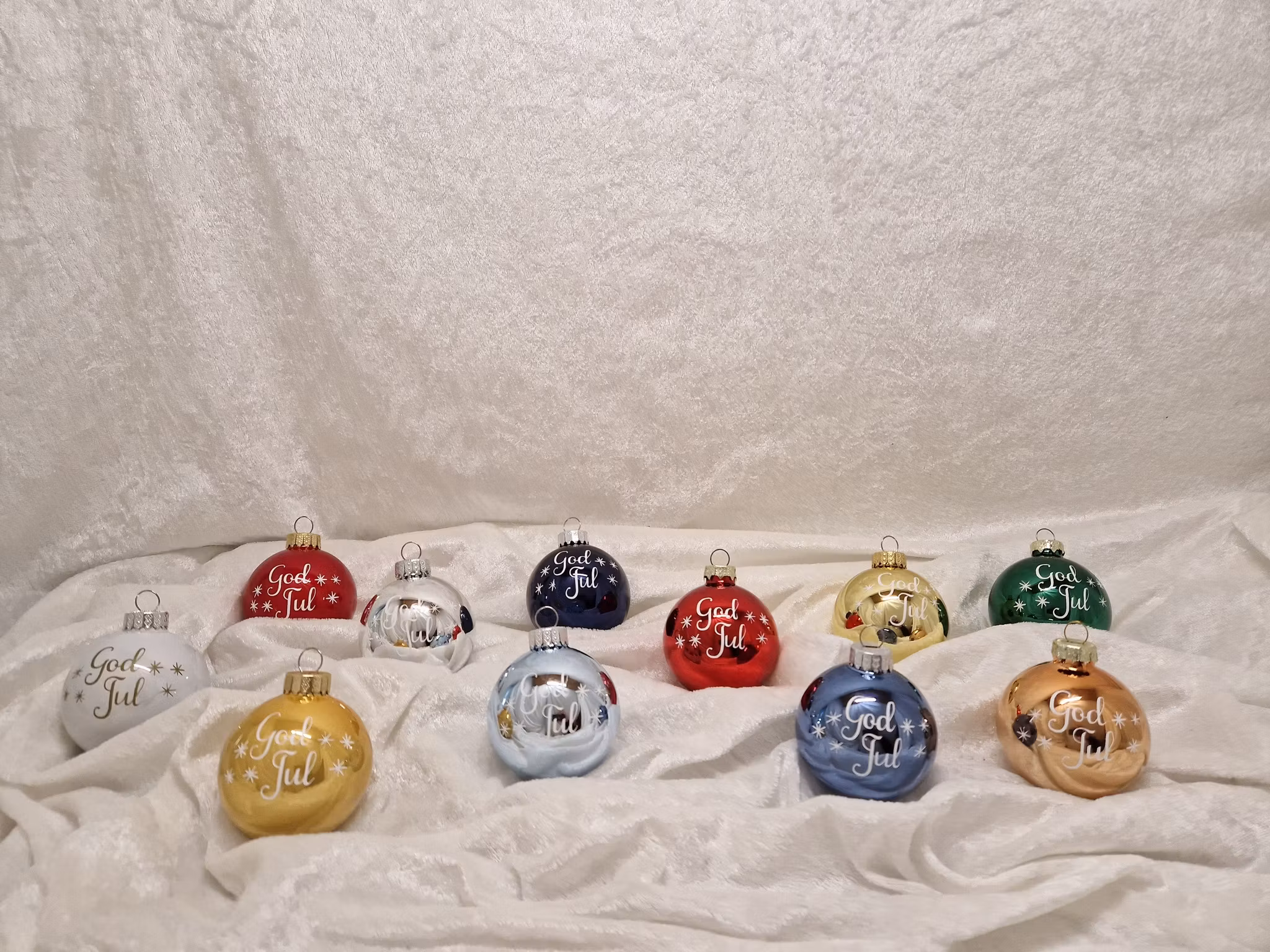 Disse kulene kommer med tekst "God Jul" på den ene siden og ønsket tekst på den andre siden.