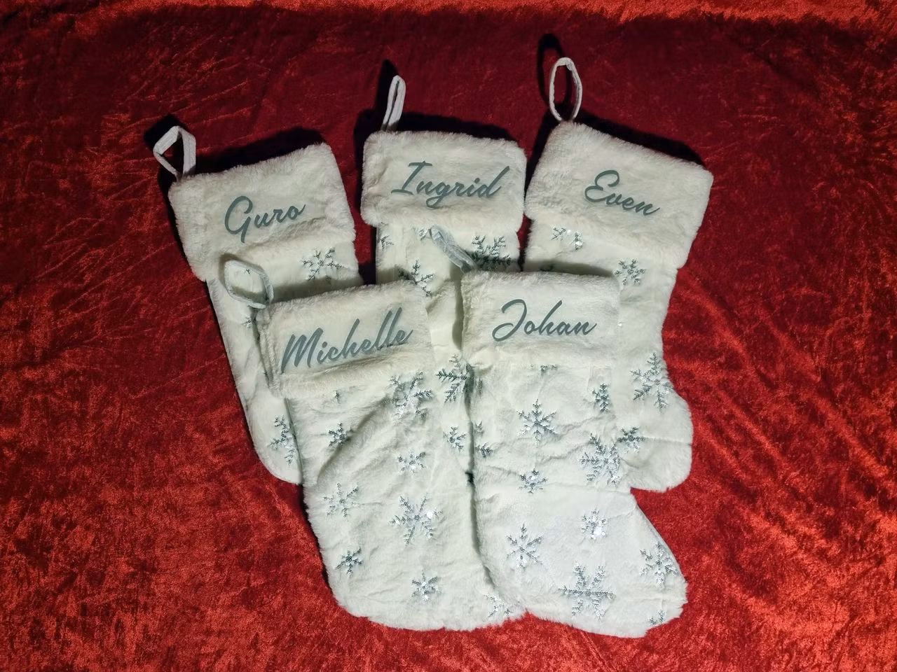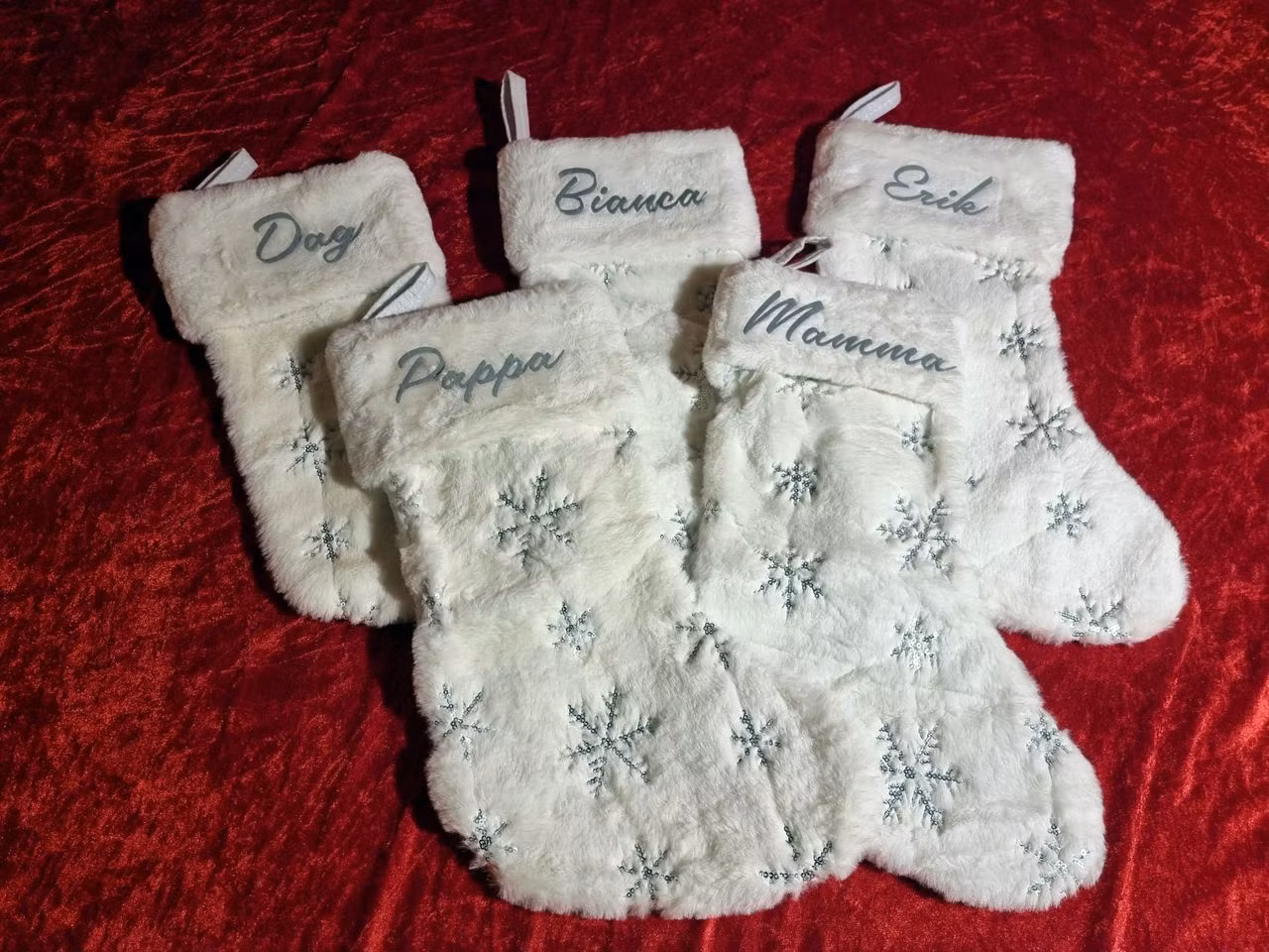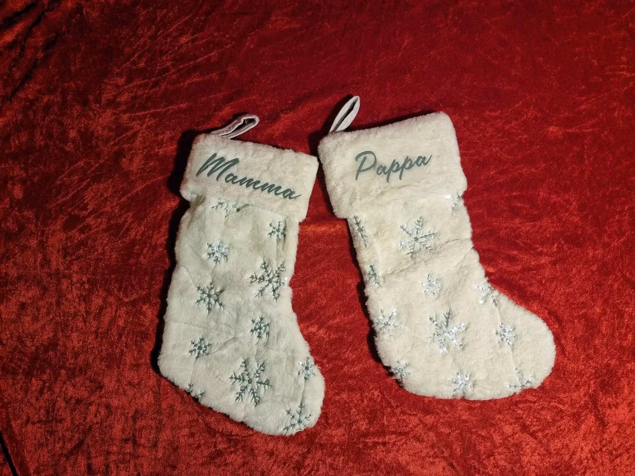 Julestrømper med personlig trykk. Hvit med myk og pusete fremside, og snøkrystaller av paljetter. Strømpene på bildet har navnet trykket med flock vinyl som har en pusete overflate.
