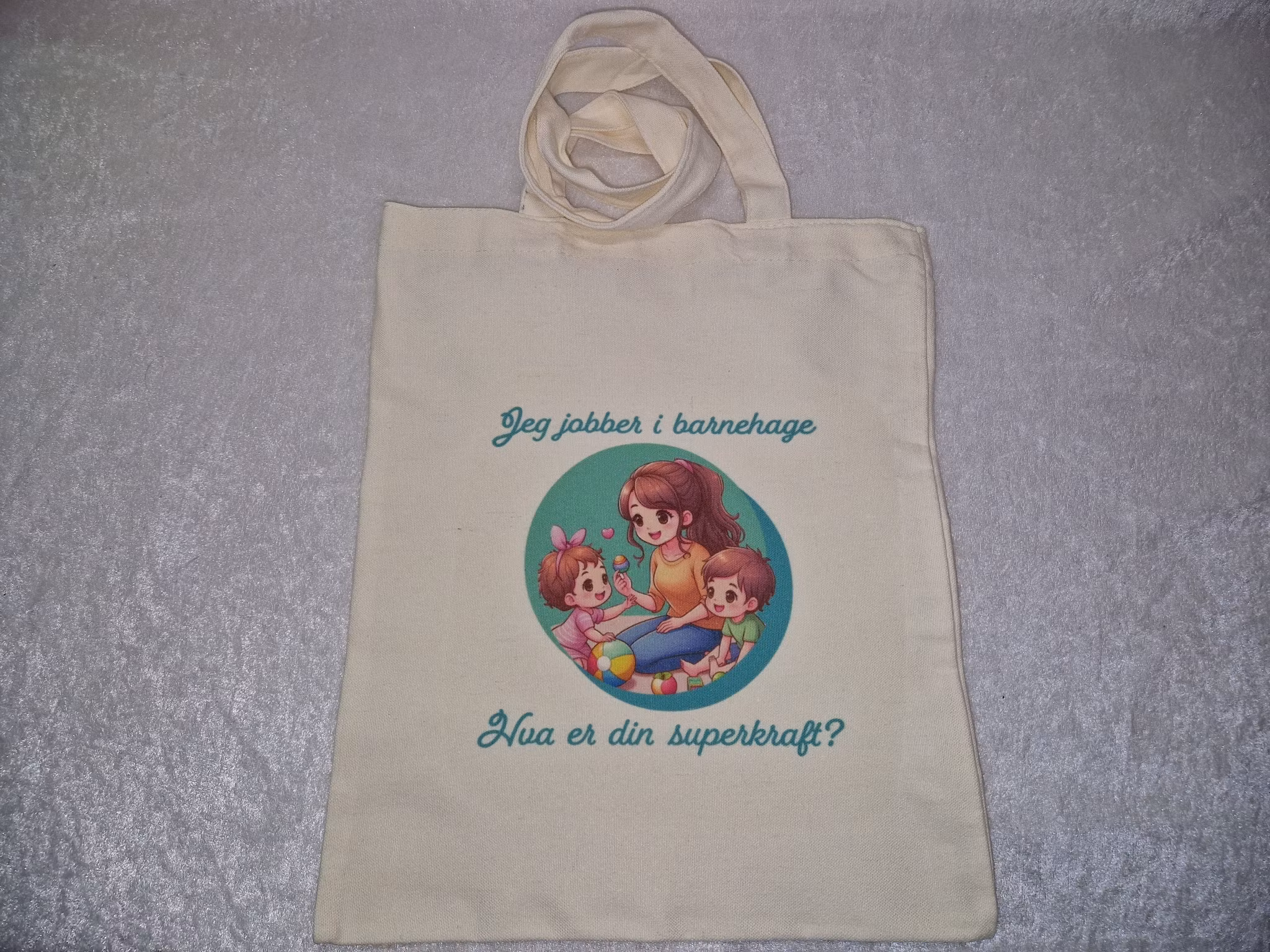 Handlenett med "Jeg jobber i barnehage" trykk.